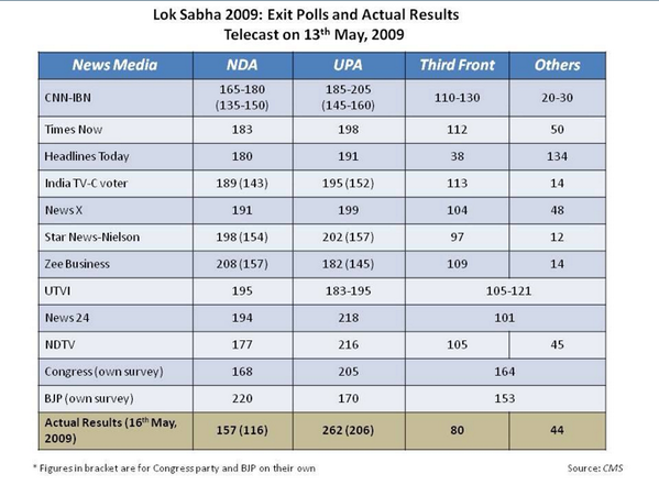 Categories Image Lok Sabha 2009:Exit Polls and Actual Results Post author By Raoji Post date May 11, 2014 No Comments on Lok Sabha 2009:Exit Polls and Actual Results Share this: Click to share on Facebook (Opens in new window) Facebook Click to share on LinkedIn (Opens in new window) LinkedIn Click to share on X (Opens in new window) X Click to share on WhatsApp (Opens in new window) WhatsApp Click to email a link to a friend (Opens in new window) Email ← I saw the fangs of Mahatma Gandhi → Linkfest:12 May,2014 Leave a ReplyYour email address will not be published. Required fields are marked *Comment * Name * Email * Website Notify me of follow-up comments by email. Notify me of new posts by email. Δ