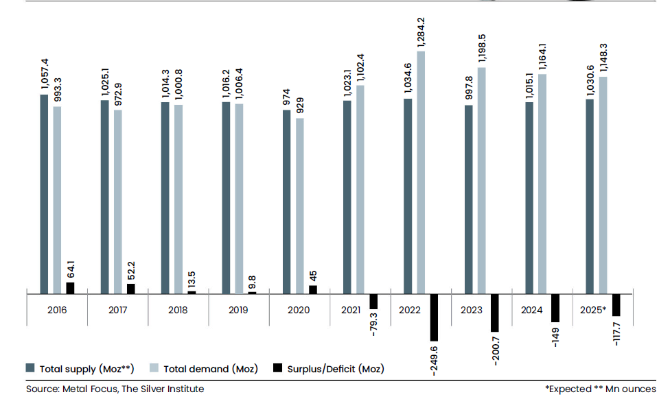 Categories Silver Silver: Demand & Supply Post author By Raoji Post date December 15, 2025 No Comments on Silver: Demand & Supply Source: Outlook Business Share this: Click to share on Facebook (Opens in new window) Facebook Click to share on LinkedIn (Opens in new window) LinkedIn Click to share on X (Opens in new window) X Click to share on WhatsApp (Opens in new window) WhatsApp Click to email a link to a friend (Opens in new window) Email Discover more from Alpha Ideas Subscribe to get the latest posts sent to your email. Type your email… Subscribe ← Defence Spend Comparison Leave a ReplyYour email address will not be published. Required fields are marked *Comment * Name * Email * Website Notify me of follow-up comments by email. Notify me of new posts by email. Δ