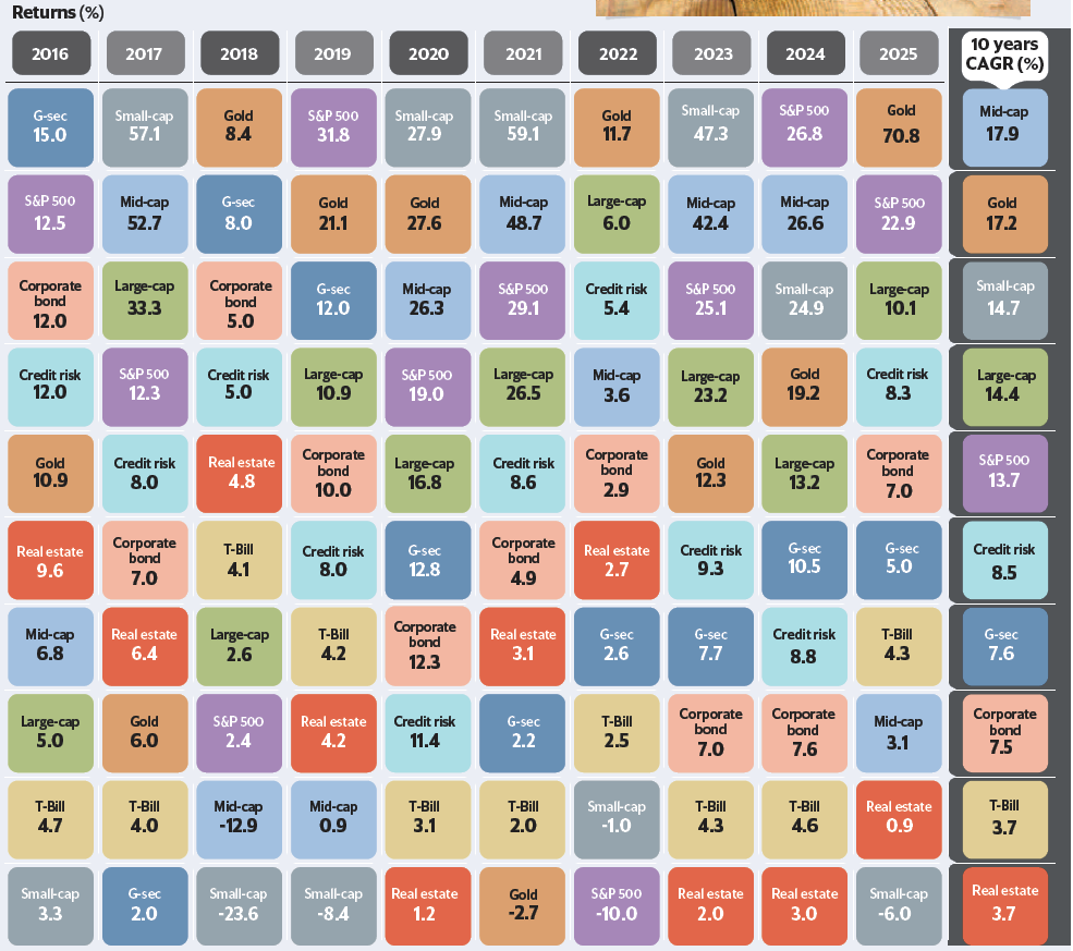 Categories Infographics 10 Year Returns Post author By Raoji Post date December 23, 2025 No Comments on 10 Year Returns Source: Mint Share this: Click to share on Facebook (Opens in new window) Facebook Click to share on LinkedIn (Opens in new window) LinkedIn Click to share on X (Opens in new window) X Click to share on WhatsApp (Opens in new window) WhatsApp Click to email a link to a friend (Opens in new window) Email Discover more from Alpha Ideas Subscribe to get the latest posts sent to your email. Type your email… Subscribe ← Linkfest: 23 December, 2025 → No Gutter Talk Leave a ReplyYour email address will not be published. Required fields are marked *Comment * Name * Email * Website Notify me of follow-up comments by email. Notify me of new posts by email. Δ