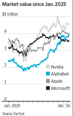 Categories Chart The $ 4 Trillion Club Post author By Raoji Post date January 13, 2026 No Comments on The $ 4 Trillion Club Source: Wall Street Journal Share this: Click to share on Facebook (Opens in new window) Facebook Click to share on LinkedIn (Opens in new window) LinkedIn Click to share on X (Opens in new window) X Click to share on WhatsApp (Opens in new window) WhatsApp Click to email a link to a friend (Opens in new window) Email Discover more from Alpha Ideas Subscribe to get the latest posts sent to your email. Type your email… Subscribe ← What a Parabolic Move looks like Leave a ReplyYour email address will not be published. Required fields are marked *Comment * Name * Email * Website Notify me of follow-up comments by email. Notify me of new posts by email. Δ