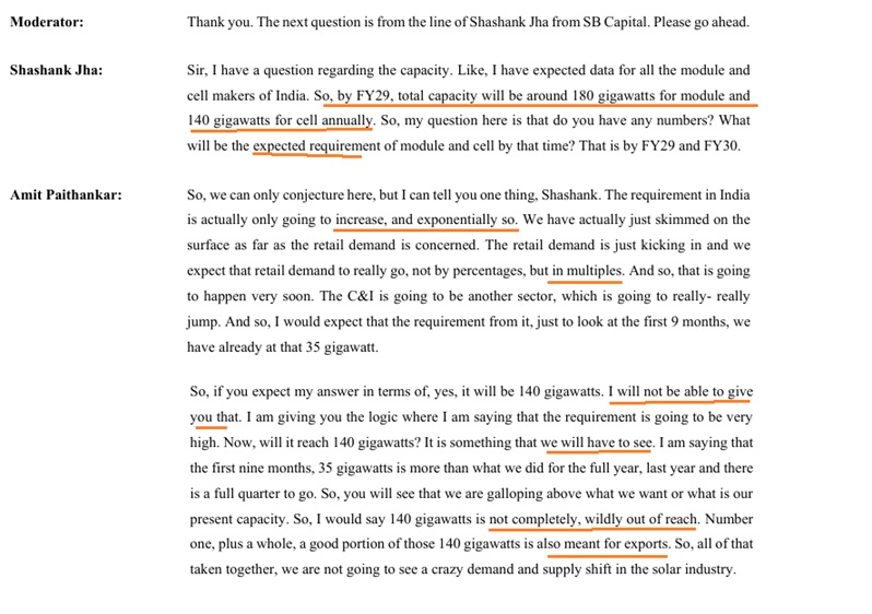 Categories ConferenceCall Waaree: Supply & Demand Post author By Raoji Post date January 29, 2026 No Comments on Waaree: Supply & Demand Source: Earnings Call of Waaree Energies Ltd Share this: Click to share on Facebook (Opens in new window) Facebook Click to share on LinkedIn (Opens in new window) LinkedIn Click to share on X (Opens in new window) X Click to share on WhatsApp (Opens in new window) WhatsApp Click to email a link to a friend (Opens in new window) Email Discover more from Alpha Ideas Subscribe to get the latest posts sent to your email. Type your email… Subscribe ← The $ Index → Linkfest: 30 January, 2026 Leave a ReplyYour email address will not be published. Required fields are marked *Comment * Name * Email * Website Notify me of follow-up comments by email. Notify me of new posts by email. Δ