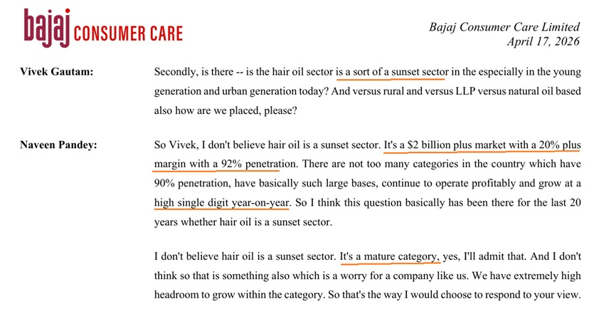 Categories FMCG Hair Oil : Bald Truth Post author By Raoji Post date April 20, 2026 No Comments on Hair Oil : Bald Truth Source: Earnings Call of Bajaj Consumer Care Ltd Share this: Share on Facebook (Opens in new window) Facebook Share on LinkedIn (Opens in new window) LinkedIn Share on X (Opens in new window) X Share on WhatsApp (Opens in new window) WhatsApp Email a link to a friend (Opens in new window) Email Discover more from Alpha Ideas Subscribe to get the latest posts sent to your email. Type your email… Subscribe ← Linkfest: 20 April, 2026 Leave a ReplyYour email address will not be published. Required fields are marked *Comment * Name * Email * Website Notify me of follow-up comments by email. Notify me of new posts by email. Δ
